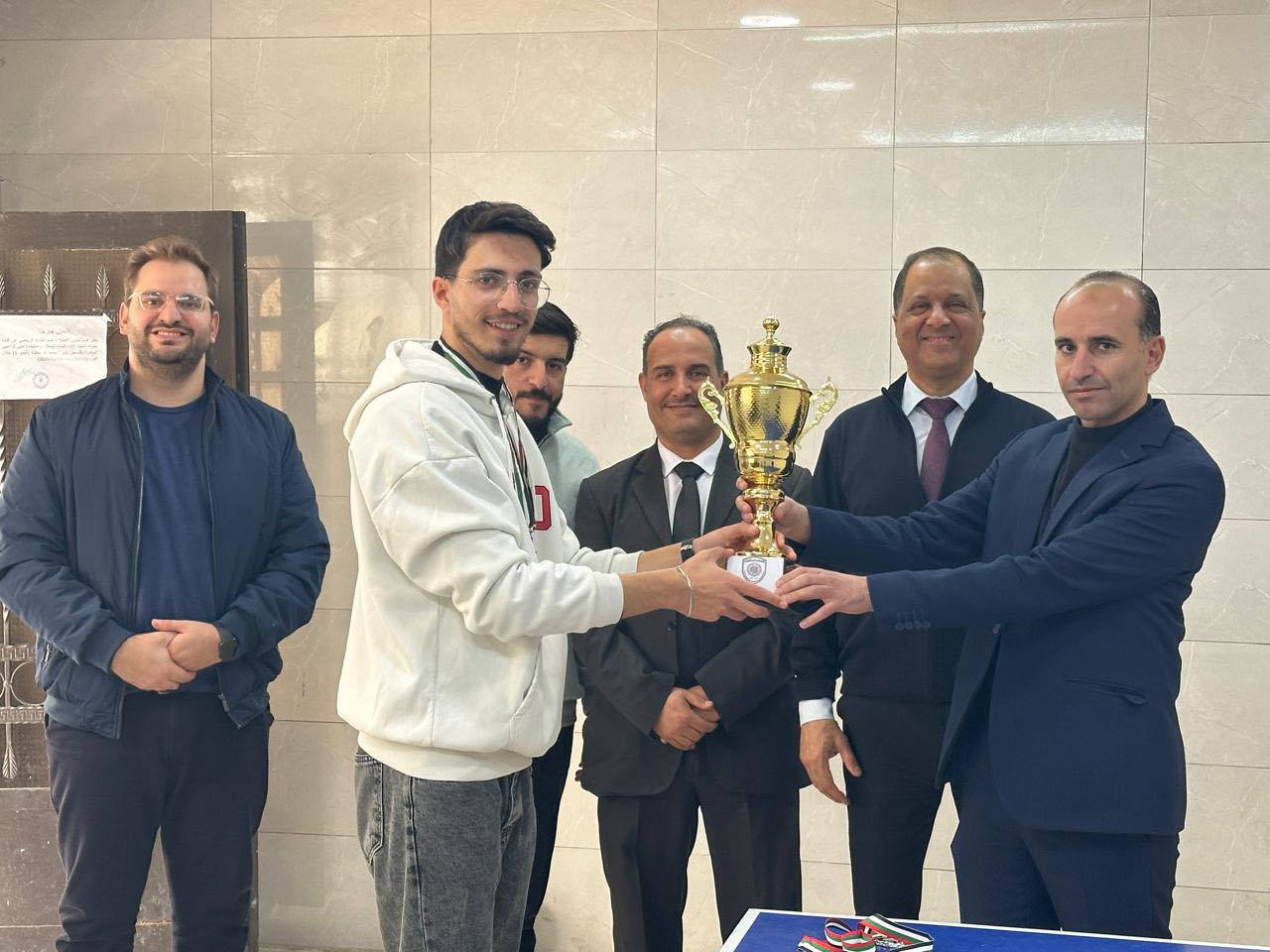 وفي الختام، تُوِّج الطالب تامر عثمان تخصص التسويق الإلكتروني بالمركز الأول وحصل على الميدالية الذهبية وكأس البطولة، فيما حصل الطالب عبادة شقفة تخصص هندسة العمارة على المركز الثاني والميدالية الفضية، وسط أجواء احتفالية من طلبة الكلية وحضور د. محمد ابودخينة وأ. عطية صليح أكدت أهمية دعم الأنشطة الرياضية في الكلية.