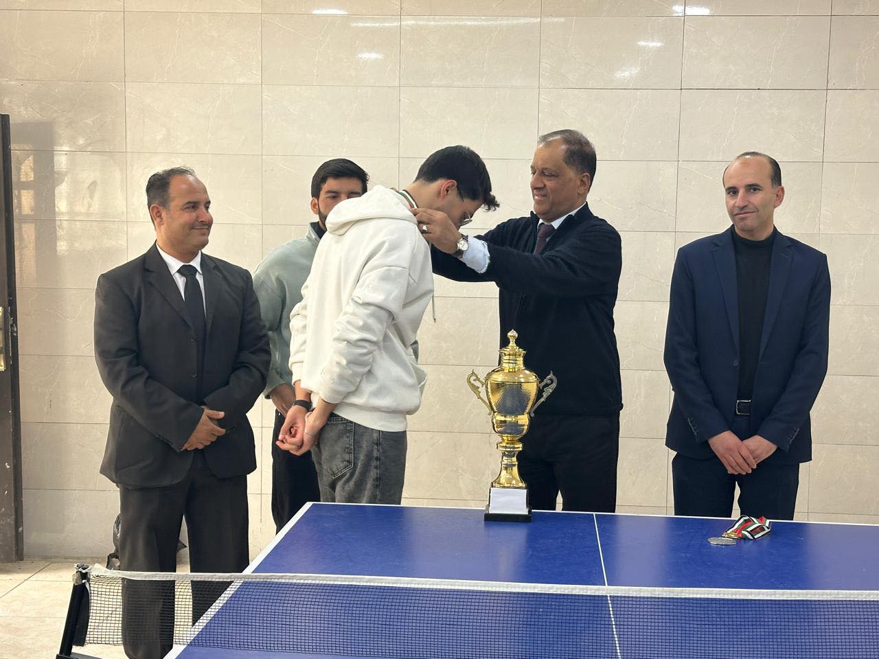 وفي الختام، تُوِّج الطالب تامر عثمان تخصص التسويق الإلكتروني بالمركز الأول وحصل على الميدالية الذهبية وكأس البطولة، فيما حصل الطالب عبادة شقفة تخصص هندسة العمارة على المركز الثاني والميدالية الفضية، وسط أجواء احتفالية من طلبة الكلية وحضور د. محمد ابودخينة وأ. عطية صليح أكدت أهمية دعم الأنشطة الرياضية في الكلية.